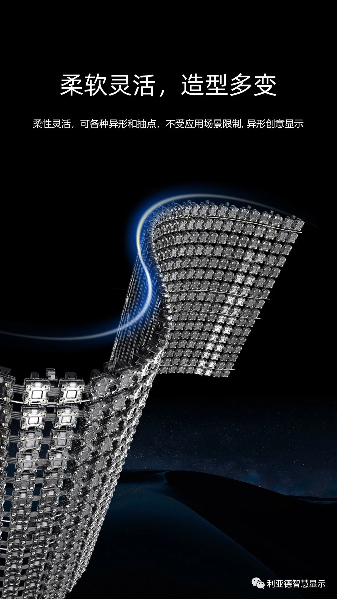 MC’s main high-definition conformal screen display solution, P16-25mm pitch perfectly complements the existing market’s existing conformal screens (led flexible screen/point light source) with large spacing, low resolution, and low brightness. Its high-definition, high-brightness, low energy consumption, Superior performance such as strong waterproof, UV resistance, high and low temperature resistance, and the physical characteristics of the product itself that can be bent, folded, and wound arbitrarily, providing an excellent display for large-scale performance activities, building curtain walls, creative buildings, cultural tourism night tours, landmark projects, etc. Solutions and create unlimited commercial value.