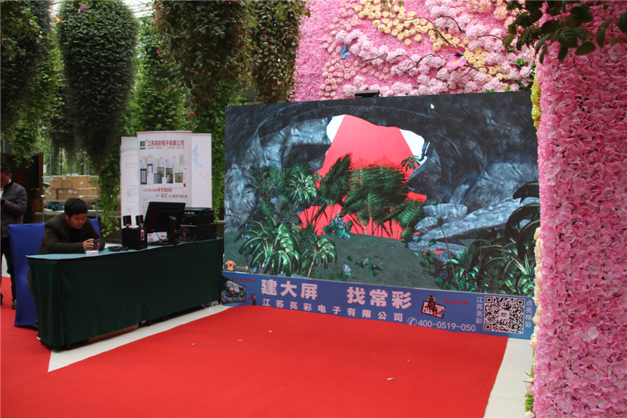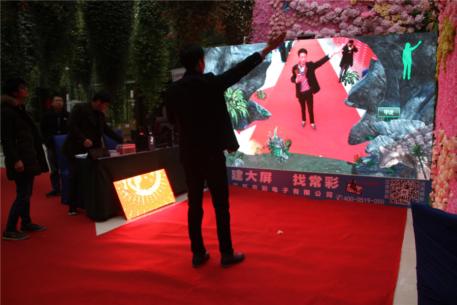 在會場的一側入口處,江蘇亮彩電子展示了時下最火的LED+3D+AR技術,通過大屏幕與人的互動,不少參會人員在一旁圍觀,也想體驗一把。